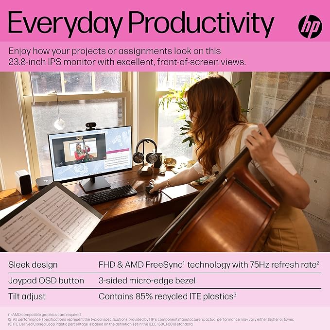 - Everyday Productivity- Expand your view and your productivity with this 23.8-inch diagonal, FHD monitor when you’re working or learning. This sleek, sizeable monitor makes computing easy and complete via a crisp, smooth screen and simple design, so you can do more everyday