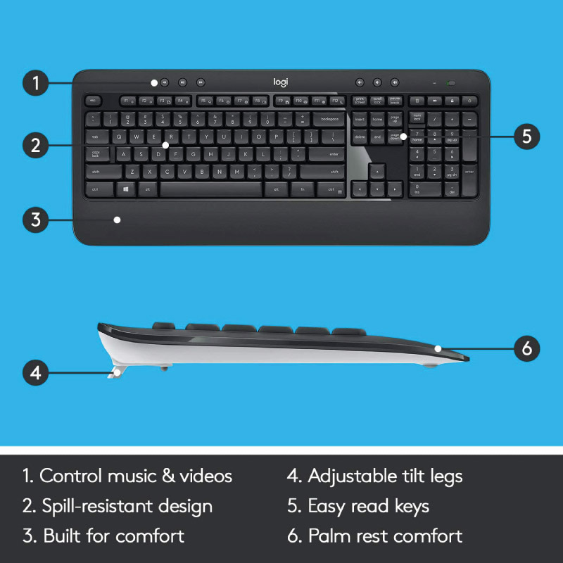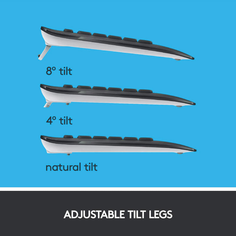 Precision Typing: An instantly familiar experience, type with ease and comfort on this full-size wireless keyboard, featuring reduced noise, palm rest, spill-resistant design (1), adjustable tilt legs