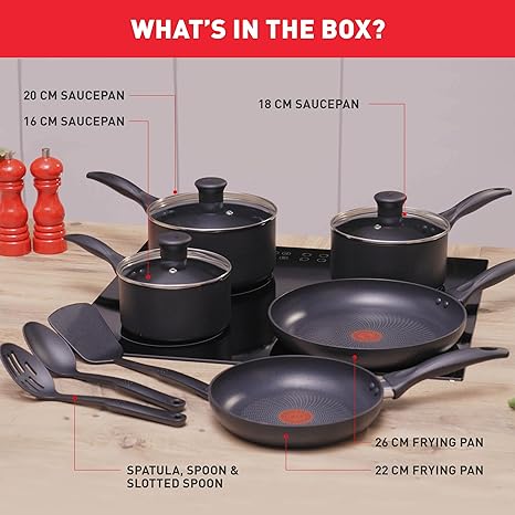 Tefal Induction Pots and Pans Sets feature the high-performance, resistant Titanium non-stick coating, ensuring great durability and effortless clean-up making cooking easy. The Thermo-Signal heat indicator changes colour when the pan is at the optimal temperature to start cooking. All saucepans come complete with a glass lid so that you can keep an eye on your cooking, ensuring nothing in burning or drying out. Suitable for all hobs including Induction. ?