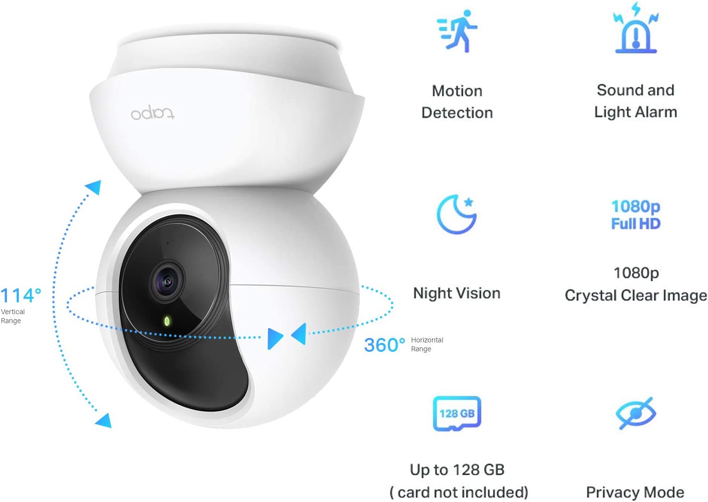 1080P HD with Pan Tilt – 360 Degree rotational and 114 Degree vertical views with 1080p resolution and night vision up to 30 ft