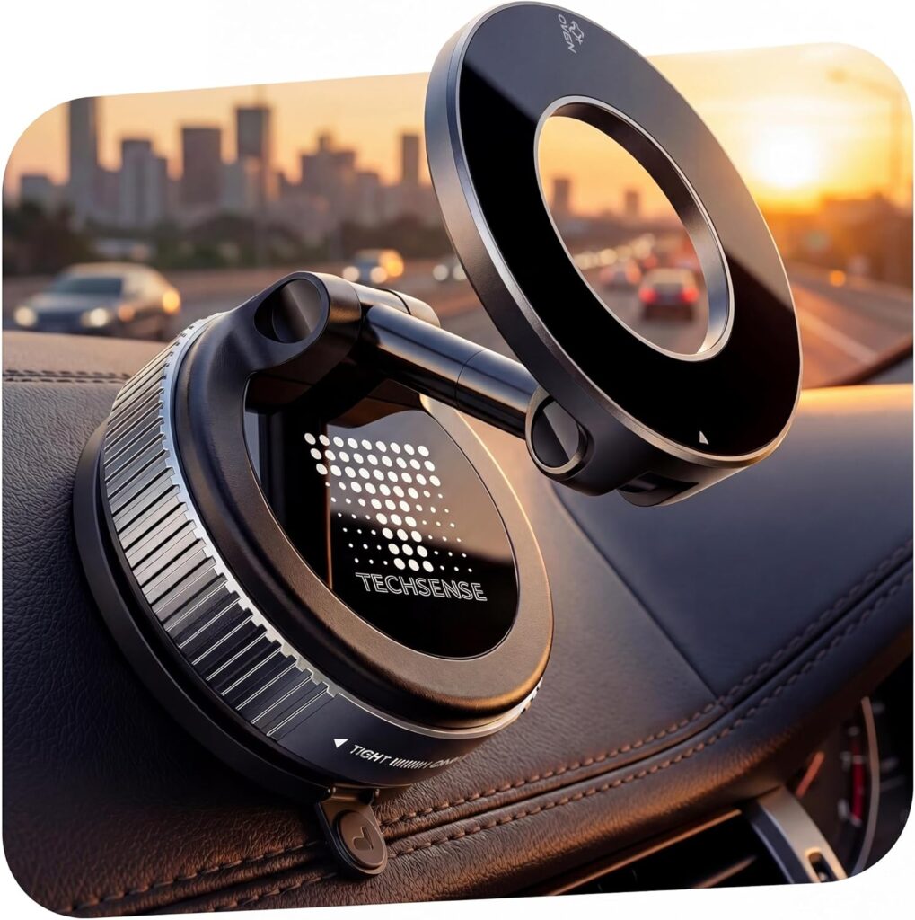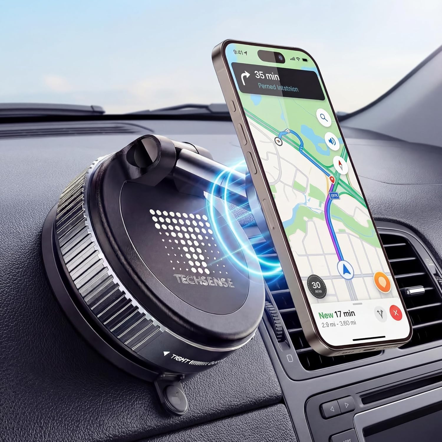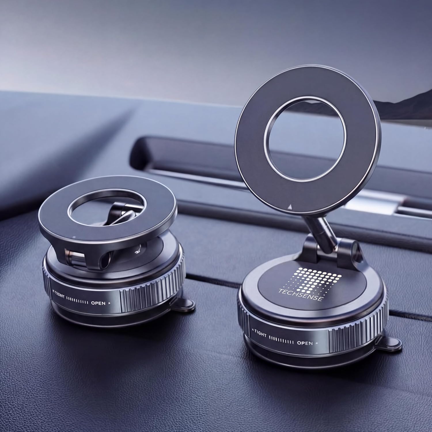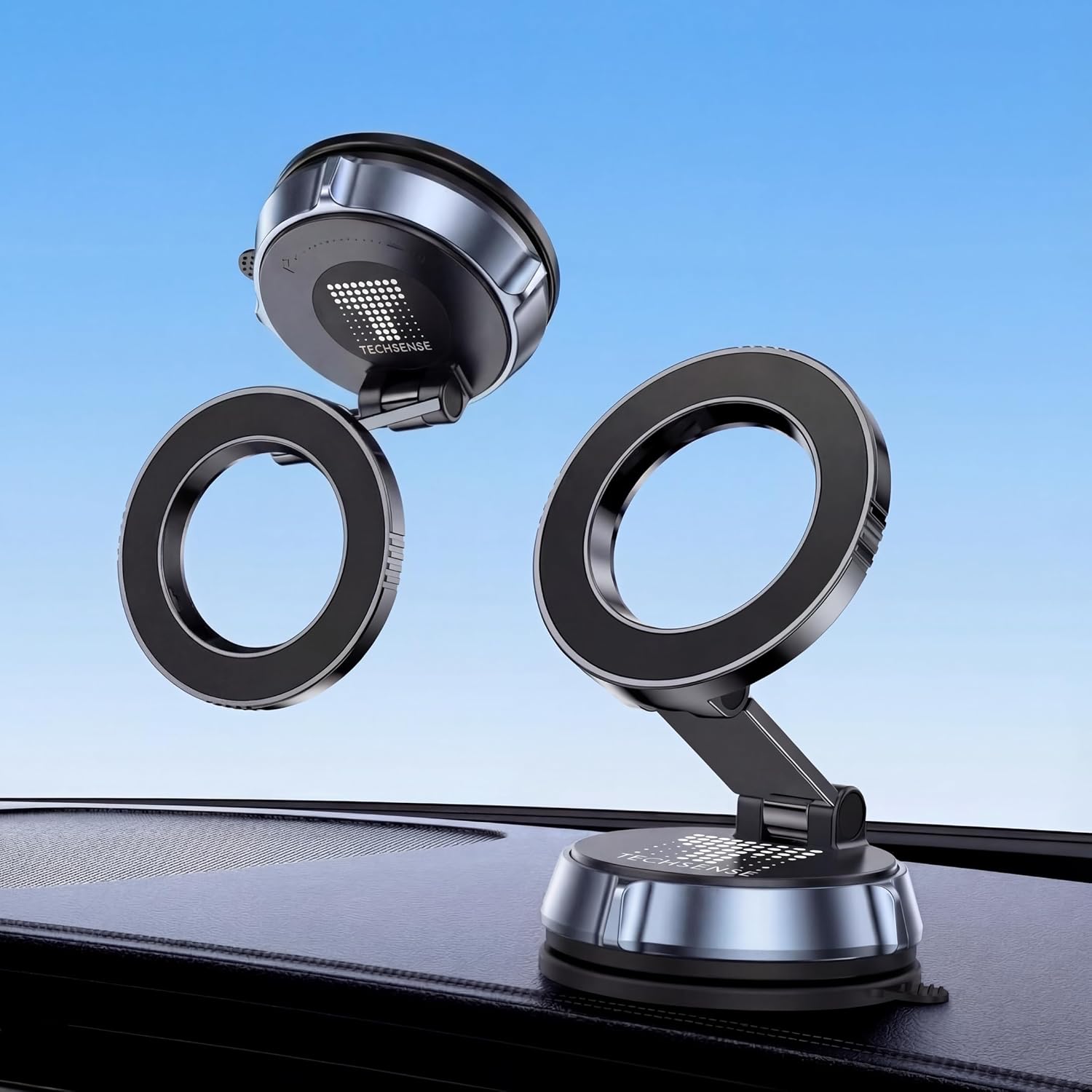 - Dual-Axis & 360° Adjustable: The Tech Sense Magnetic Car Phone Holder comes with a foldable metal arm that supports 360° rotation and vertical tilt. Effortlessly use portrait and landscape viewing for any situation. Portable making it easy to carry anywhere.